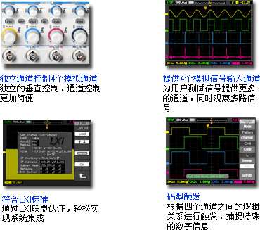4. 丰富的触发功能:边沿、视频、脉宽、交替触发,新增模拟通道码型触发功能,捕捉信号特定逻辑关系 |